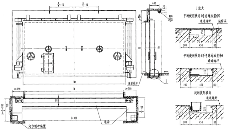 此類門的特點(diǎn)是平時(shí)地面無(wú)門檻,便于人員和車輛通行;戰(zhàn)時(shí)將門扇立轉(zhuǎn)、降落及平移,以滿足防護(hù)、密閉要求,其上帶有方便人員臨時(shí)出入的小門,平戰(zhàn)轉(zhuǎn)換快捷。新型降落門改進(jìn)了其升降機(jī)構(gòu),操作更為方便。