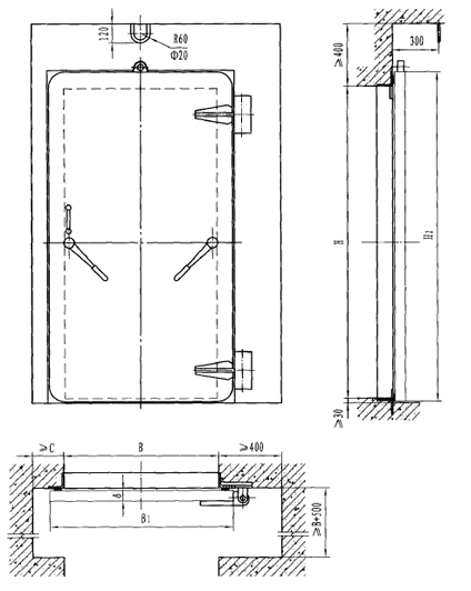 | 型號(hào) | 門(mén)孔寬B | 門(mén)孔高H | 門(mén)扇厚δ | C | B1 | H1 |