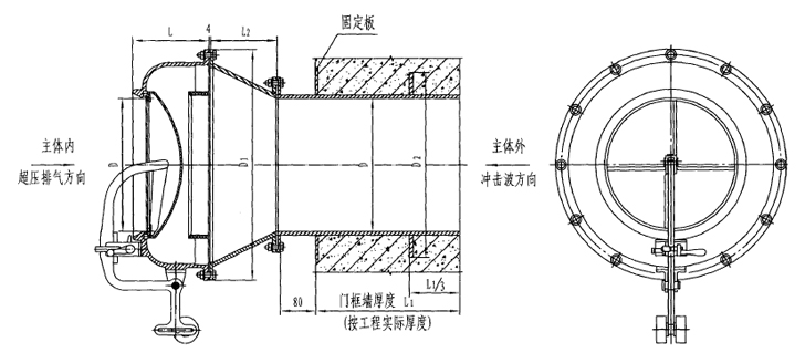 此類活門是具有防爆波性能的自動(dòng)排氣活門。其特點(diǎn)是在通風(fēng)超壓作用下可自動(dòng)開(kāi)啟排氣,當(dāng)隔絕防護(hù)時(shí)可鎖住,以滿足防護(hù)、密閉要求。