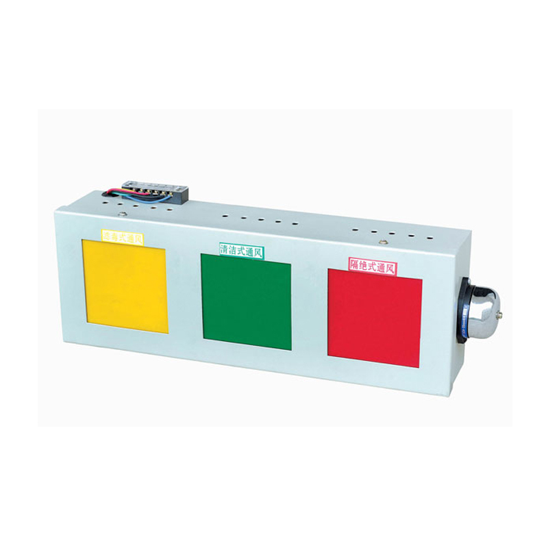 2、燈箱的結(jié)構(gòu):用于工程掩體內(nèi)部空氣質(zhì)量狀態(tài)的顯示和報警,主要對三種空氣質(zhì)量情況進行報警:清潔、隔絕、濾毒。燈箱分別用三種顏色的燈光來對三種不用空氣情況報警:清潔——綠色燈光;隔絕——紅色燈光;濾毒——黃色燈光。